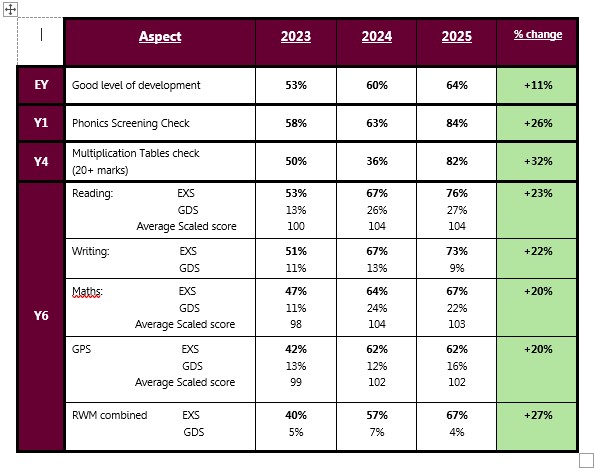 Over the last three years, our overall results in all statutory national tests have improved steadily and attainment is above the national and local authority average for outcomes at the end of KS2 (end of Y6).